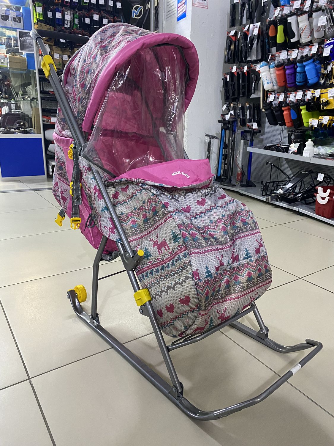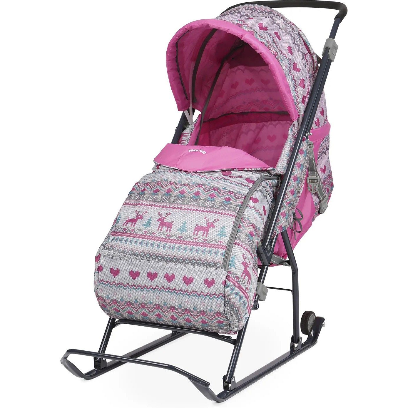 - складной высокий двухсекционный козырек с дугой на спинке позволяет чувствовать себя комфортно малышу в шапке с помпоном
