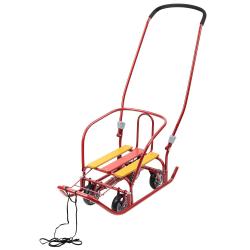 Одной из ключевых особенностей данной модели является механизм выдвижных колесных шасси, позволяющий легко катать и перевозить детей. Круглые полозья демонстрируют плавное скольжение по снегу, а продольная рейка сиденья, выполненная из окрашенного древесного материала, создаёт комфортные условия для сидения. Съёмная спинка и ступенчатая подножка добавляют удобства, позволяя ребёнку удобно разместиться во время катания.