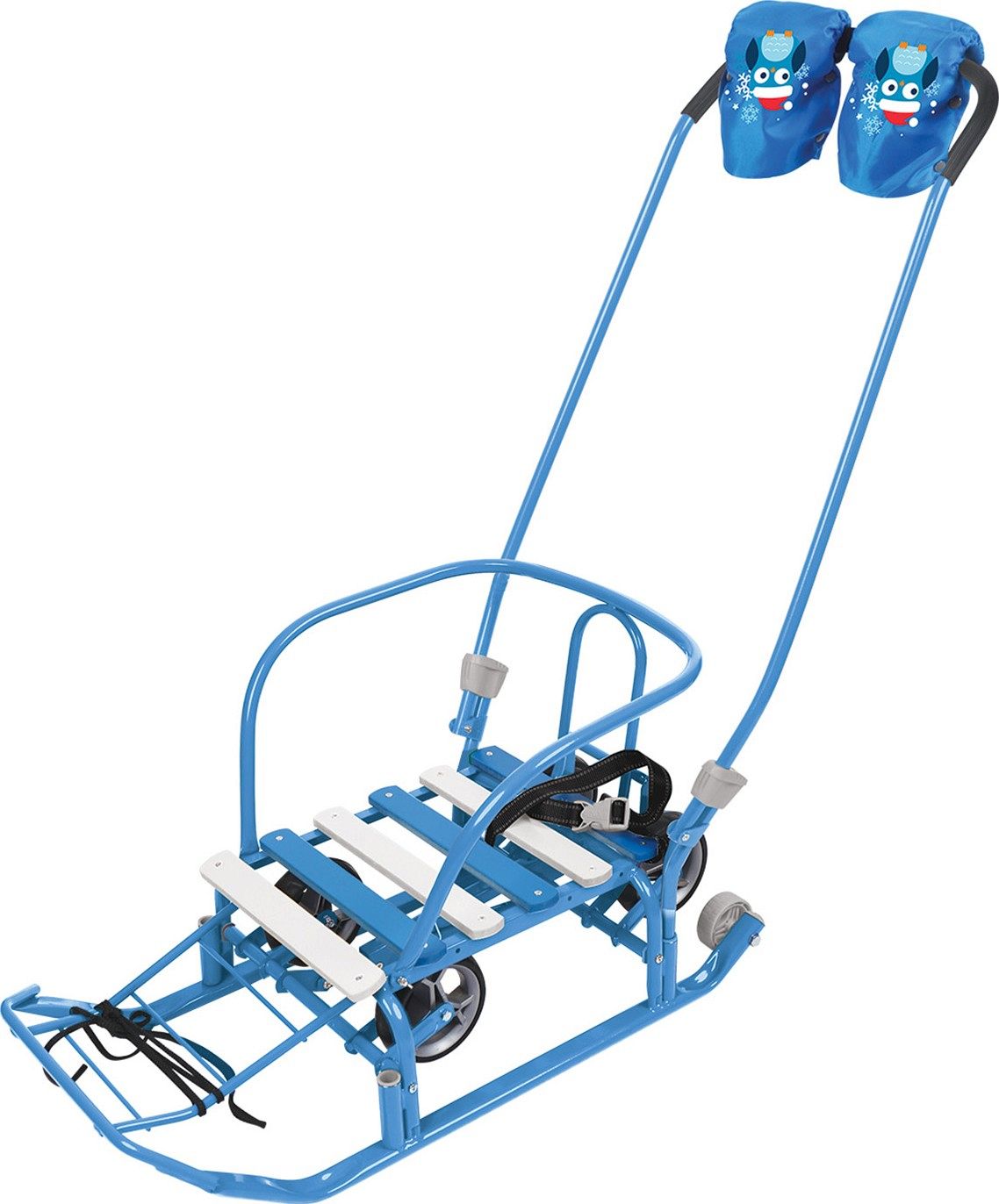 Для безопасности предусмотрен ремень, который надёжно фиксирует ребёнка на месте. Колёса на полозьях делают транспортировку санок удобной и лёгкой. Тёплые родительские рукавички, входящие в комплект, добавляют комфорта и защищают руки от холода. Грузоподъёмность до 25 кг позволяет использовать санки для детей разного возраста, создавая комфортные и безопасные условия для катания.