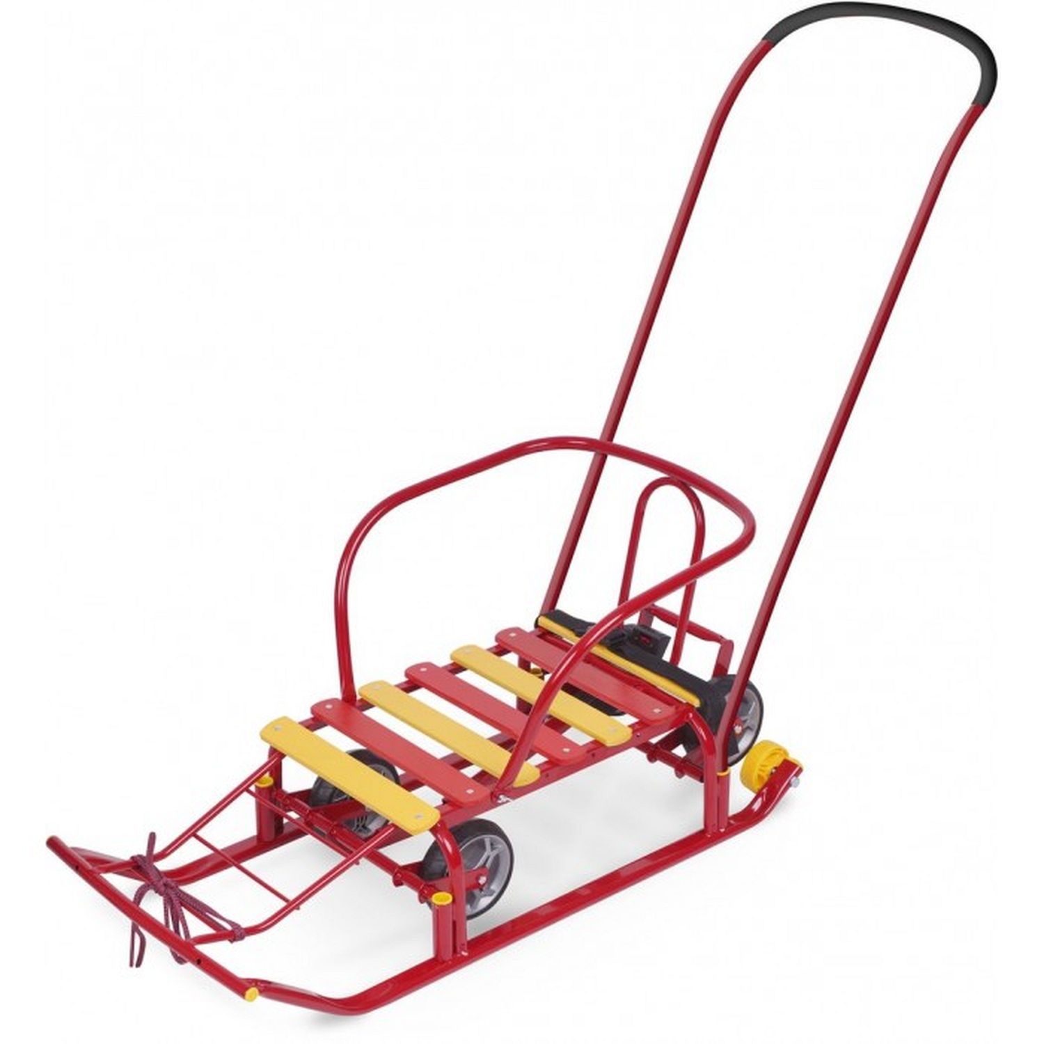 Размер изделия: без ручки - 86,5*38,5 см; высота без ручки на колесах - 47 см, на полозьях - 41 см; высота с ручкой на колесах - 100 см, на полозьях - 94 см; полозья 3*1,5 см; сиденье 46*29 см; высота по сиденье на полозьях - 18 см, на колесах - 24 см
