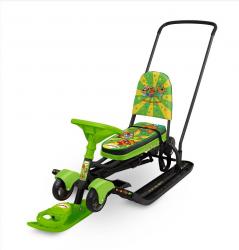 Выдвижные шасси позволяют легко переключаться между полозьями и колёсами – снегокат можно катить не только по снегу, но и по асфальту или твёрдому покрытию. Это удобно при переходах между дворами и поездках по городу.