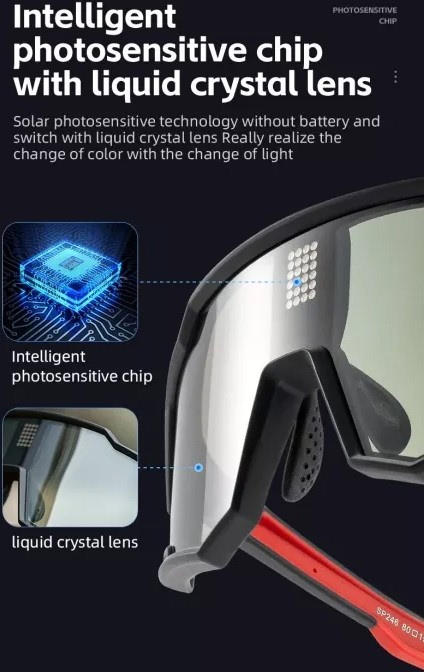 – Электро фотохромные линзы. Поликарбонат автоматически меняет степень затемнения в зависимости от освещённости, защищая глаза в солнечную погоду и при переходе в тень.